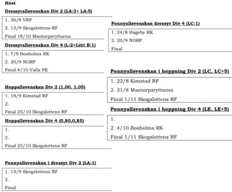 I höst kan man rida allsvenskan i division 2 och 4 i hoppning och dressyr. Datum och klasser ser ni nedan. Att rida i lag är jättekul. Vi hejar och stöttar varandra i både med- och motgång.